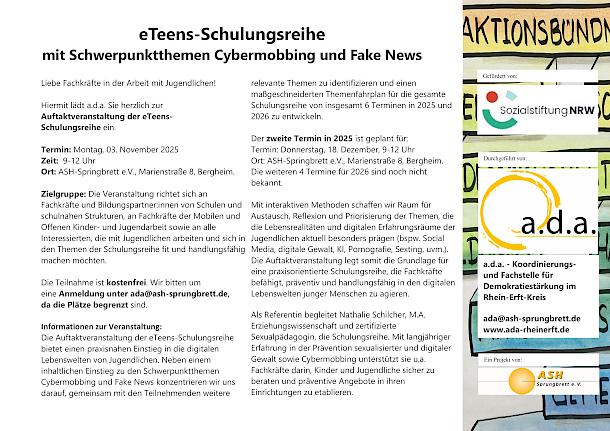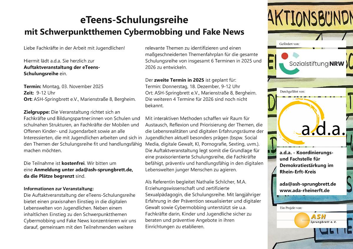 Mit dem durch die Sozialstiftung NRW geförderten und am 01.01.2025 gestarteten Modellprojekt eTeens, ermöglicht ASH-Sprungbrett e.V. Jugendlichen eine souveräne digitale Teilhabe. Da das Internet inzwischen einen besonderen Kommunikations- und Beschäftigungsort für Jugendliche darstellt, werden die Jugendlichen durch entsprechende Workshops und Fortbildungsformate dazu befähigt, kritisch und reflektiert mit der Vielzahl an Informationen in sozialen Netzwerken umzugehen.
